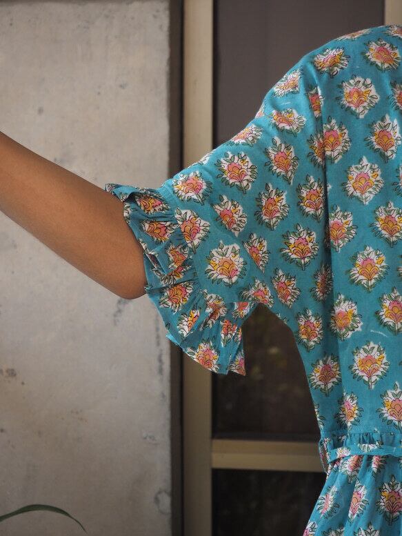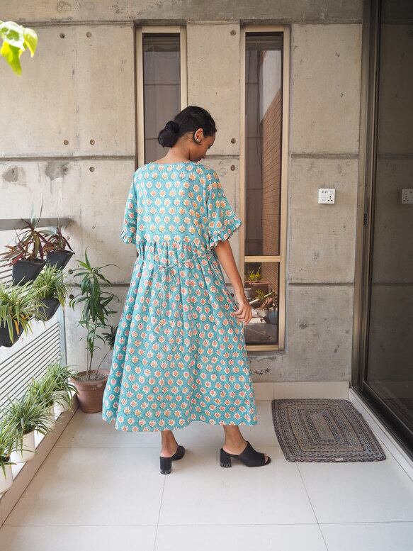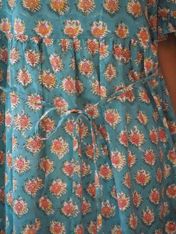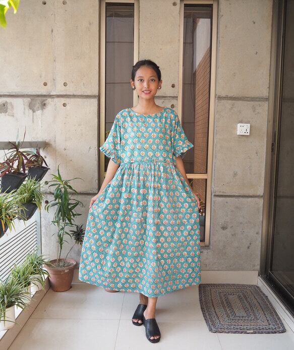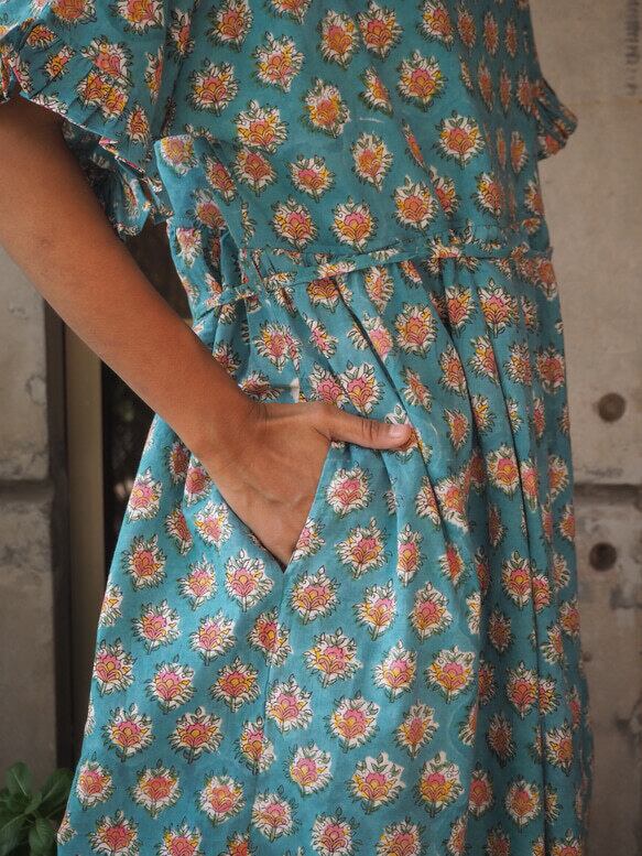 フリルスリーブワンピース(インド綿、スクリーンプリント)