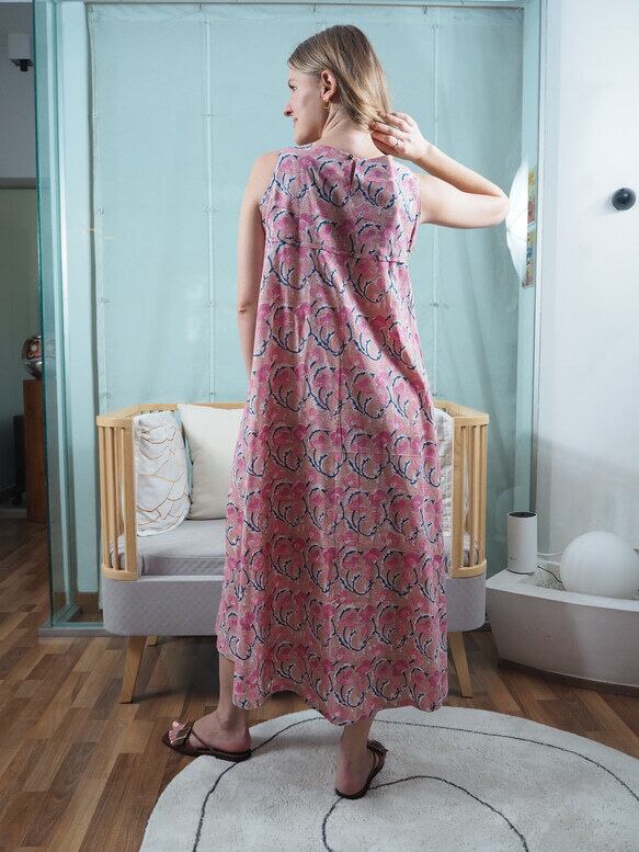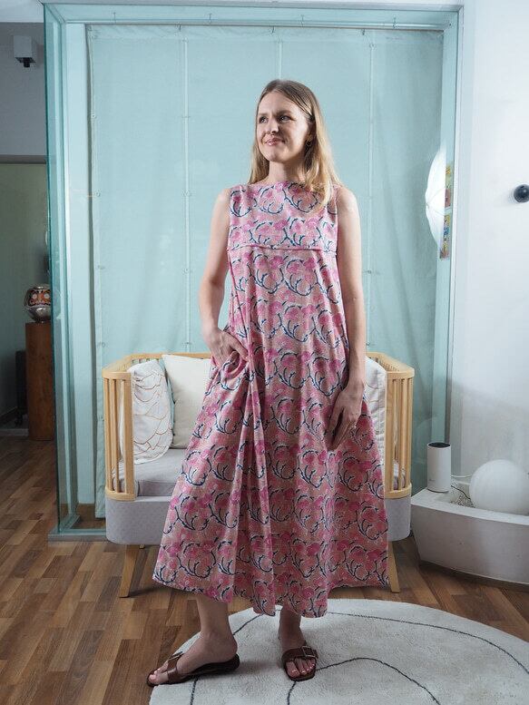 インド綿/Aラインワンピース/マキシ丈 (ハンドブロックプリント)