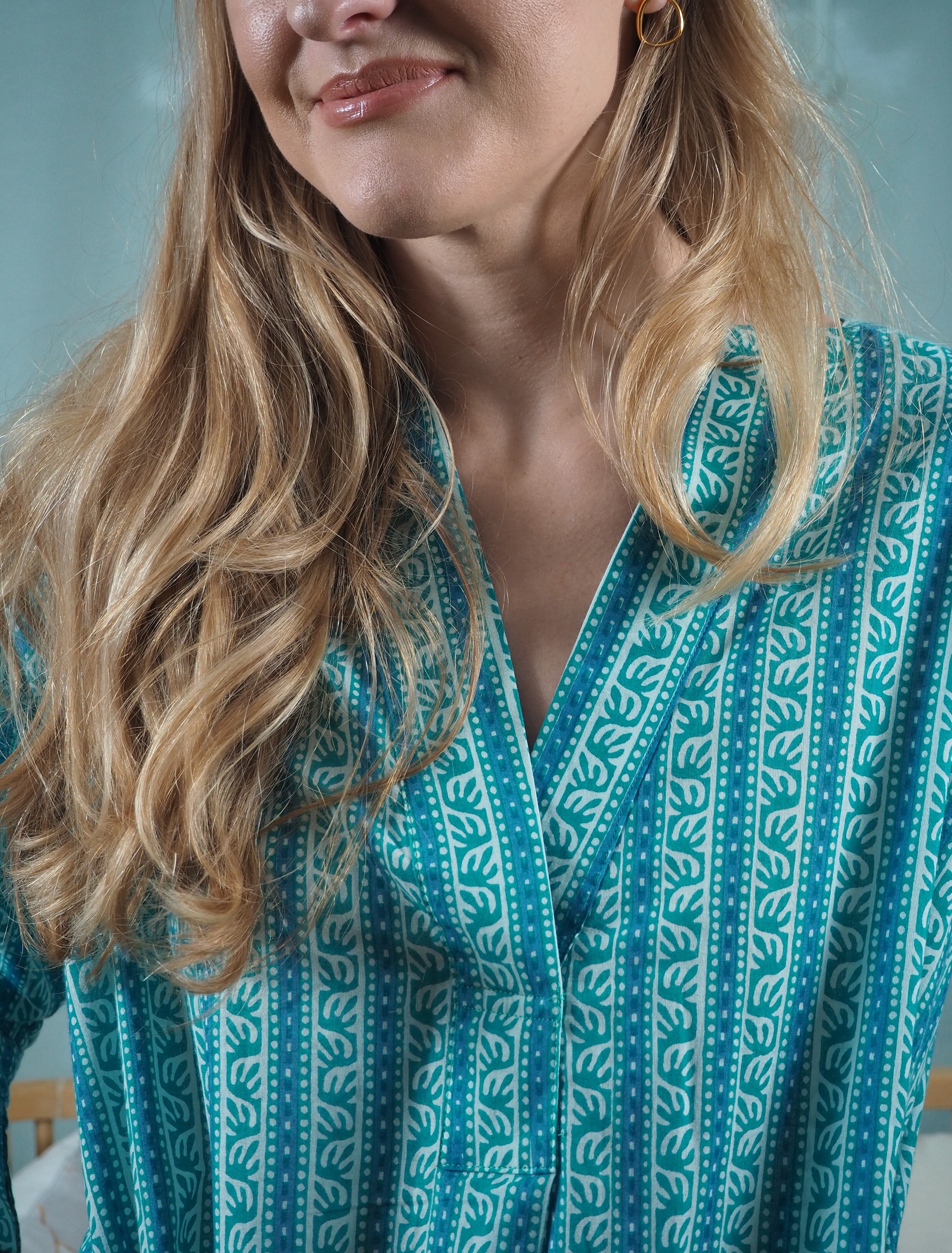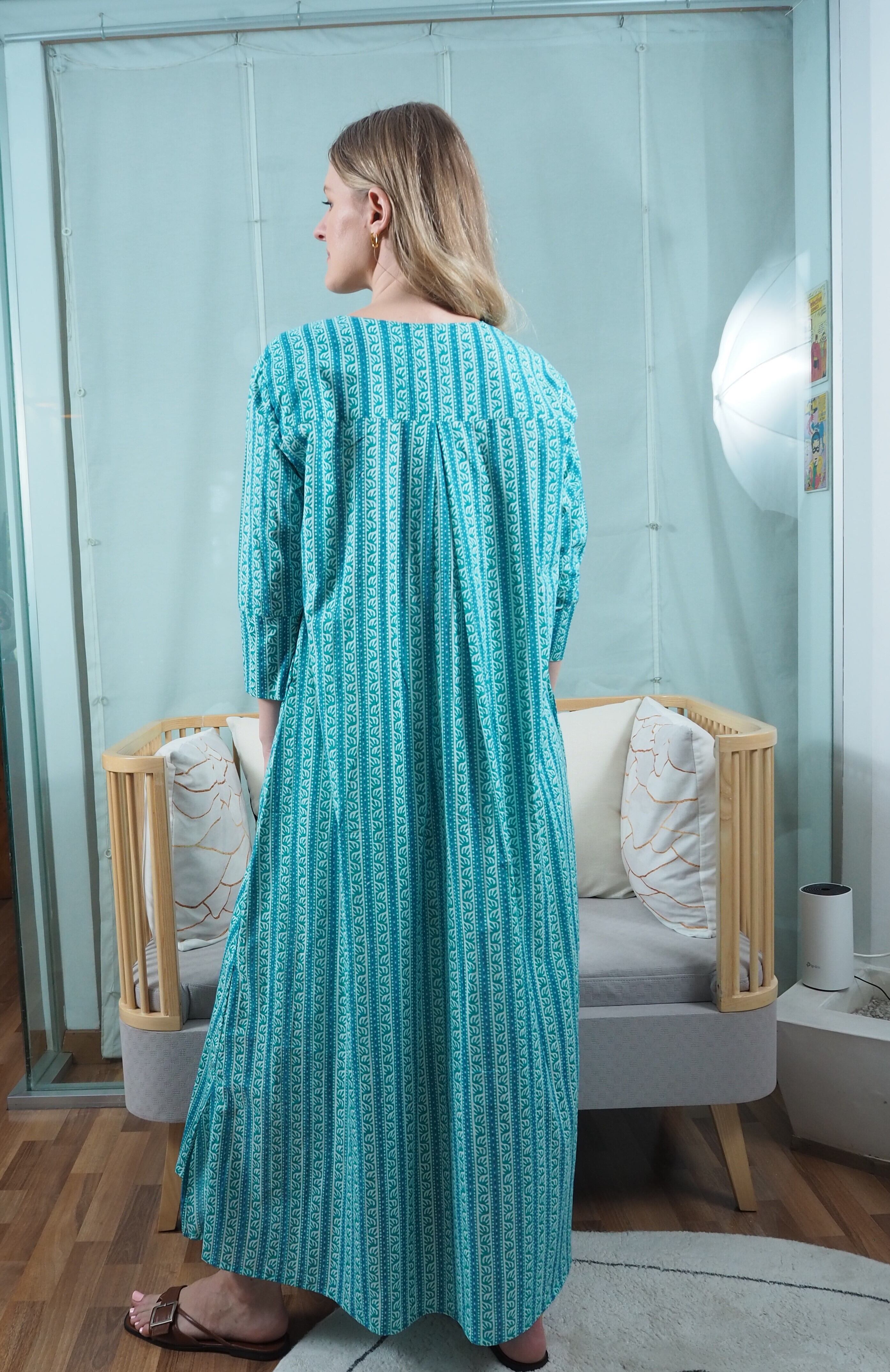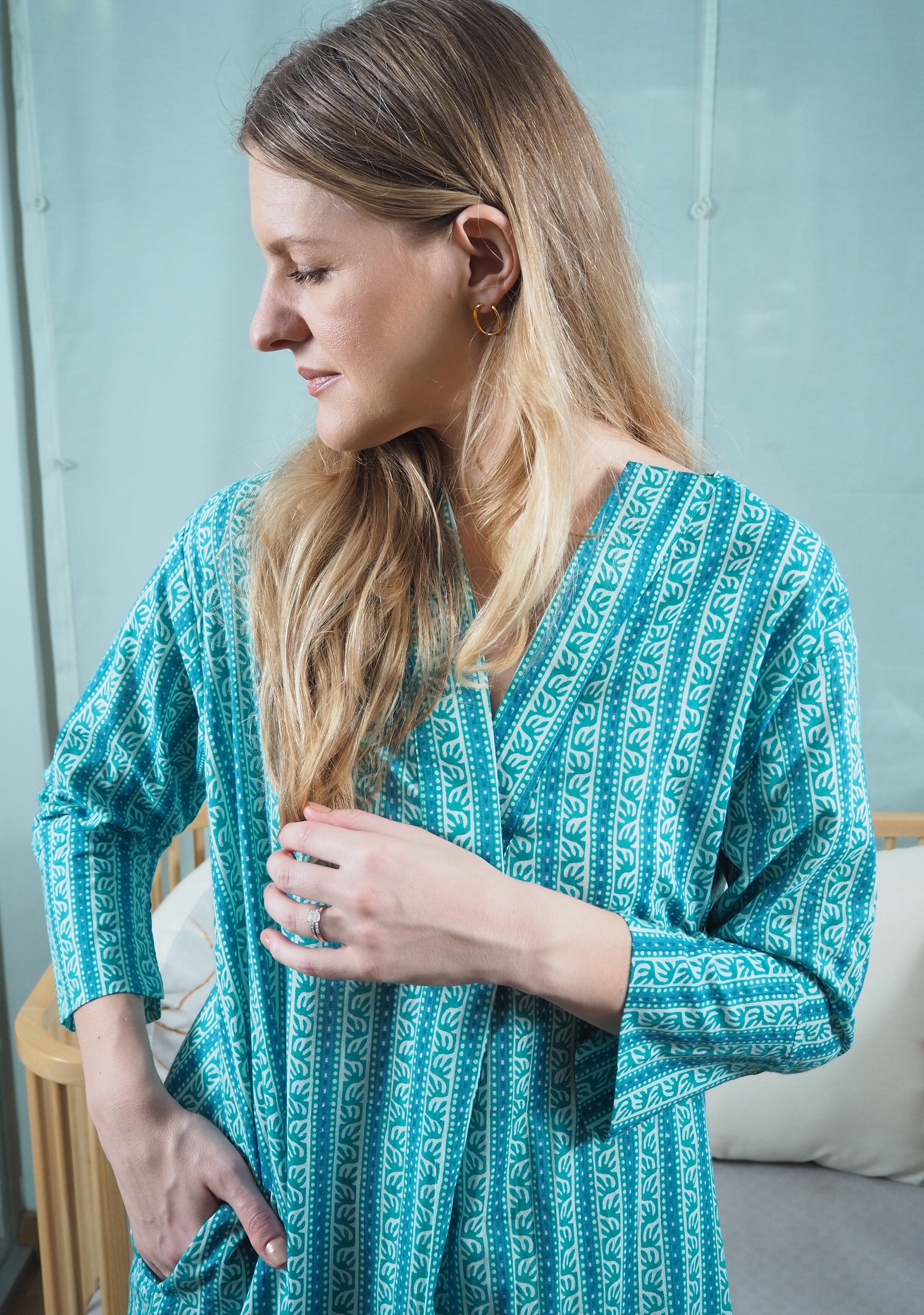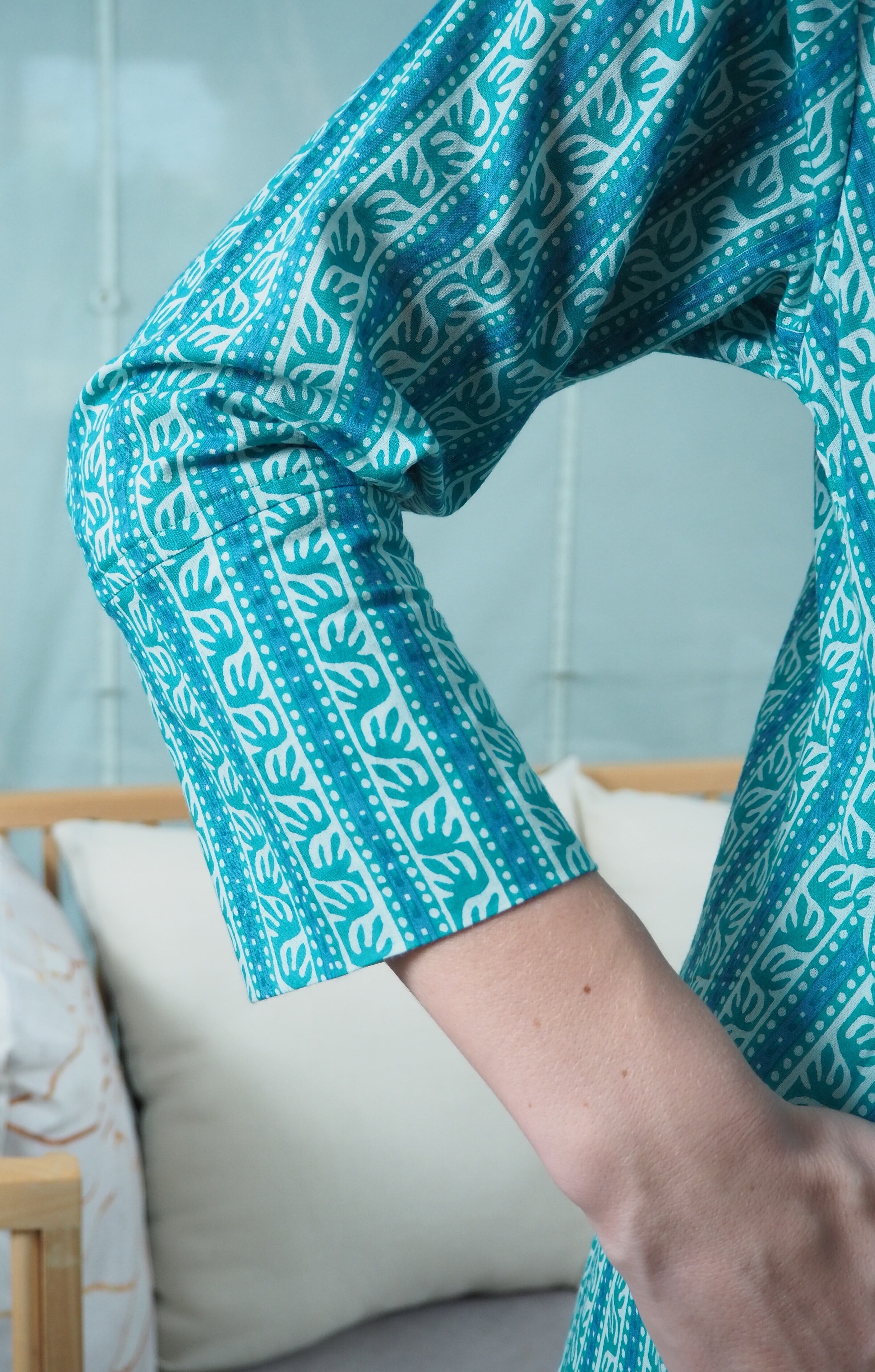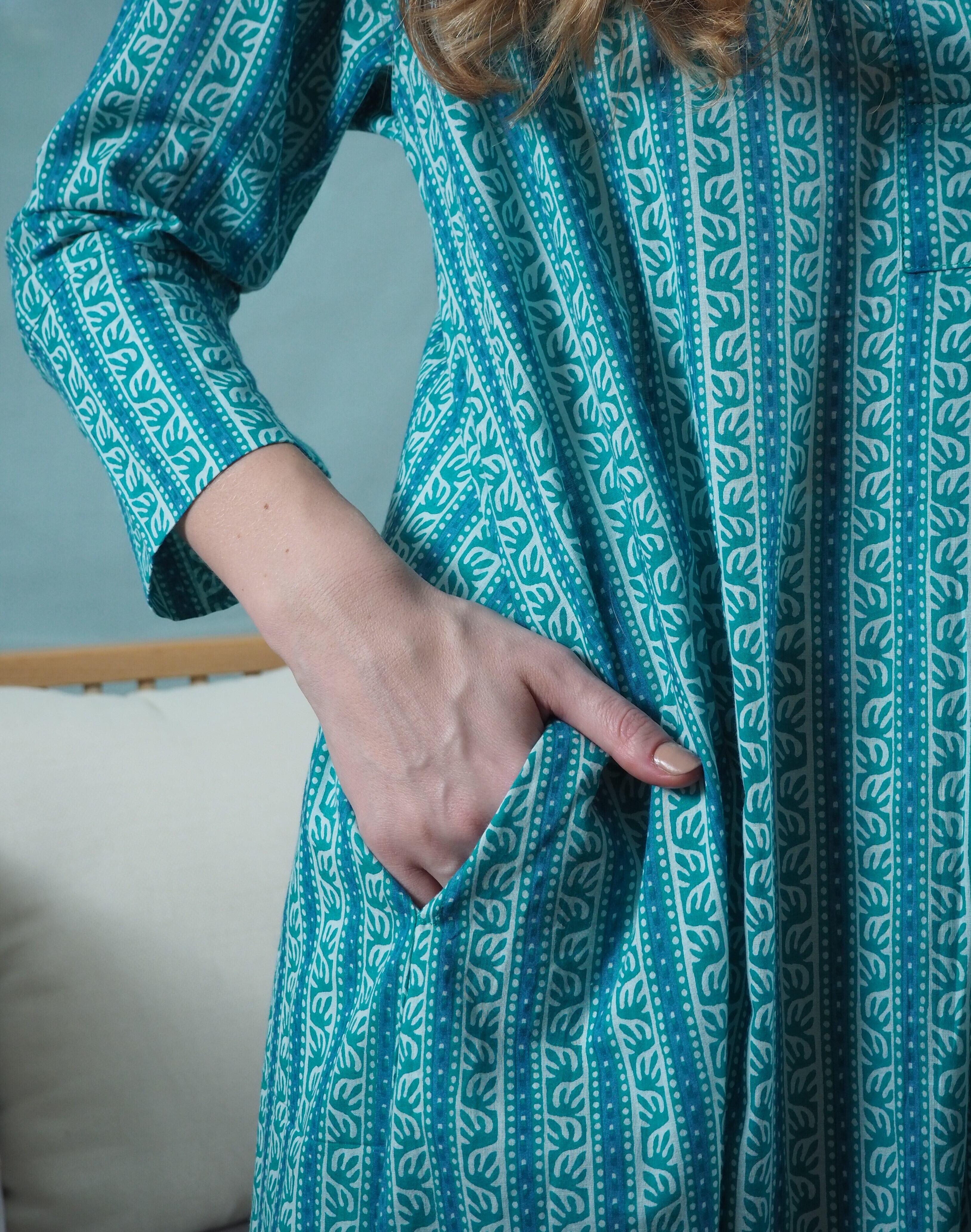 *弊社の取り扱っているインド綿は基本1ロール20M程度となっており、また多くの洋服が4-5M必要とするようなギャザーやタックが入っているもののため1つの柄布から4-5着しかお作りする事ができません。商品の販売を複数サイトで行っており、在庫の更新が間に合わなく同じタイミングで布の在庫以上の商品の購入を受けてしまう事があったり、布に落ちないシミが見つかったりして商品の縫製が出来ない事がございます。