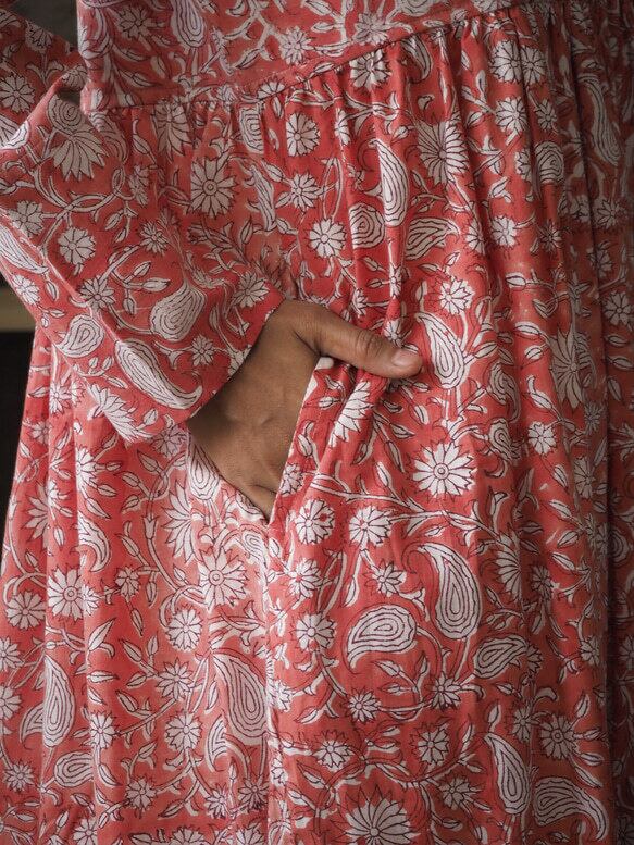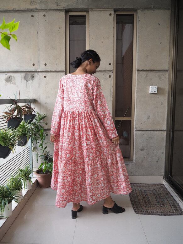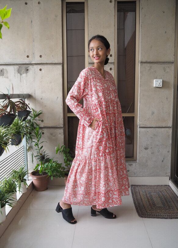 インド綿Vネックティアードワンピース(ハンドブロックプリント)