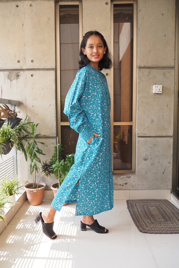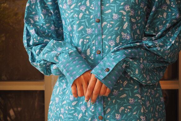*弊社の取り扱っているインド綿は基本1ロール20M程度となっており、また多くの洋服が4-5M必要とするようなギャザーやタックが入っているもののため1つの柄布から4-5着しかお作りする事ができません。商品の販売を複数サイトで行っており、在庫の更新が間に合わなく同じタイミングで布の在庫以上の商品の購入を受けてしまう事があったり、布に落ちないシミが見つかったりして商品の縫製が出来ない事がございます。