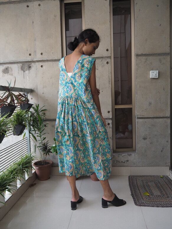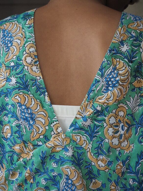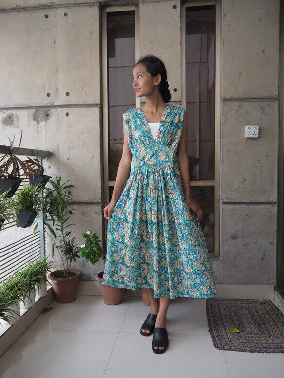<インド綿/スクリーンプリント>コットン細見えVネックワンピース